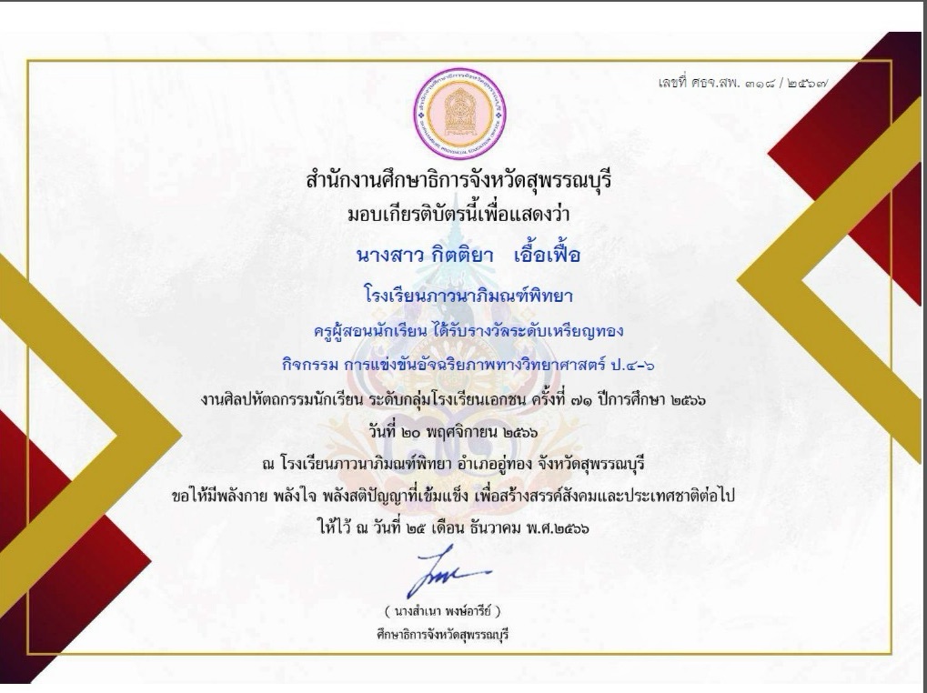 ครูผู้ฝึกซ้อมนักเรียน ได้รับรางวัลระดับเหรียญทอง